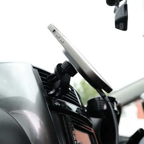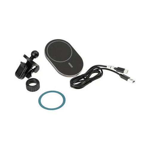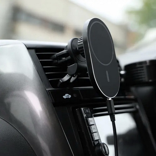 Держатель предназначен для фиксации и беспроводной зарядки телефона в автомобиле. Разработан для устройств, поддерживающих технологию беспроводного заряда (MagSafe). Устройство крепится к дефлектору автомобиля с помощью силиконовой ножки-прищепки. Телефон фиксируется с помощью магнитов внутри держателя, что обеспечивает простоту и надежность установки. Шарнирное соединение головки держателя позволяет изменять положение телефона под любым углом, обеспечивая удобство использования и оптимальный обзор экрана. Благодаря быстрой зарядке до 15 Вт смартфон будет всегда заряжен, даже в длительных поездках.