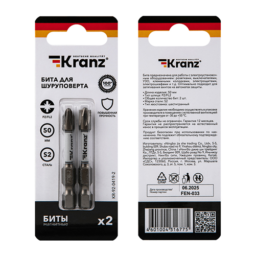 Бита PZ/FL2*50 мм для шуруповерта (2шт/уп) KRANZ