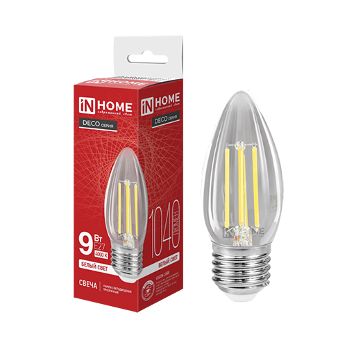 Лампа LED свеча 9.0Вт Е27 4000К 220V 1040Лм прозрачная IN HOME-deco (10/50)