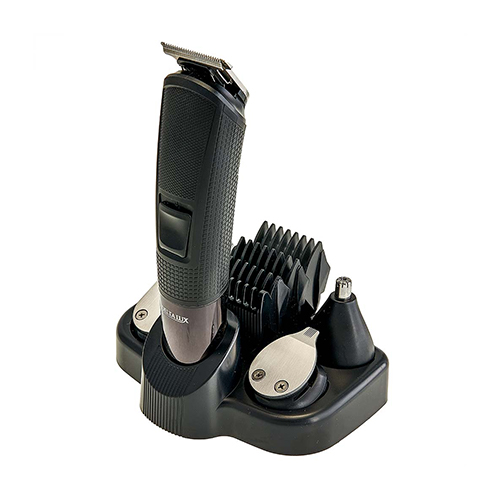 Набор для стрижки и бритья 5 в 1 предназначен для стрижки волос, сухого бритья, коррекции причёски, усов, бороды, а также для подрезания волос в носу и ушах в бытовых условиях, с номинальной мощностью 5 Вт, временем непрерывной работы и зарядки аккумулятора по 90 минут, температурой эксплуатации от +5°C до +35°C, удобным корпусом чёрного цвета, лезвиями из нержавеющей стали, LED-дисплеем, двумя режимами работы (от сети и от аккумулятора), возможностью зарядки от ПК, адаптера или портативного аккумулятора, с аккумулятором типа 14500 Li-ion 3,7 В 600 мА·ч, пятью съёмными насадками (бритва, для коррекции, для носа и ушей, стандартный и узкий триммер), пятью съёмными гребнями (3, 6, 9, 12 мм и для узкого триммера), USB-шнуром питания (адаптер не входит), маслёнкой, щёточкой для чистки и подставкой для хранения.
