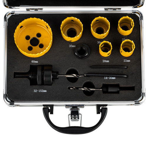 Набор поставляется в металлическим кейсе. В комплектацию входят 11 предметов: 6 коронок диаметром 20, 22, 25, 30, 35, 60 мм, 2 хвостовика для коронок, 2 шестигранных ключа,