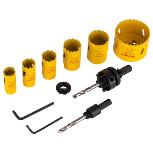 Коронки, входящие в состав набора, выполнены из инструментальной стали, а зубья с переменным шагом 4-6 мм изготовлены из быстрорежущей стали Р6М5К8 с добавлением 8% кобальта, что обеспечивает стойкость к перегреву.