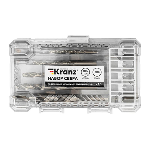 Набор сверл 10пр комбинированный (по металлу 5 шт, по бетону 4 шт, ступенчатое 1 шт) KRANZ