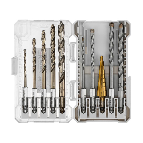 Комбинированный набор KRANZ — универсальное решение для домашнего и профессионального применения, так как в нем собраны сверла для различных материалов и типов работ. Сверла, входящие в состав набора, используются с шуруповертами, дрелями. Все изделия имеют шестигранные хвостовики для надежной фиксации в патроне. Сверла по металлу выполнены из быстрорежущей стали HSS. Покрытие из нитрида титана (TiN) обеспечивает стойкость инструмента к коррозии и перегреву при сверлении. Сверла по бетону изготовлены из высококачественной легированной стали, оснащены твердосплавными напайками для эффективного сверления кирпича, камня и бетона. Ступенчатое сверло из быстрорежущей стали HSS с покрытием (TiN) используется для сверления металла, пластика и других материалов различной толщины. Специальная конструкция позволяет выполнять отверстия разного диаметра без необходимости частой смены инструмента. Для удобства хранения и транспортировки набор поставляется в ударопрочном и удобном пластиковом кейсе. Комплектация: Сверла по металлу (HSS, TiN), 5 шт.: 3, 4, 5, 6, 8 мм; Сверла по бетону (ВК8), 4 шт.: 4, 5, 6, 8 мм; Ступенчатое сверло (HSS, TiN), 1 шт.: диапазон диаметров 4–12 мм.