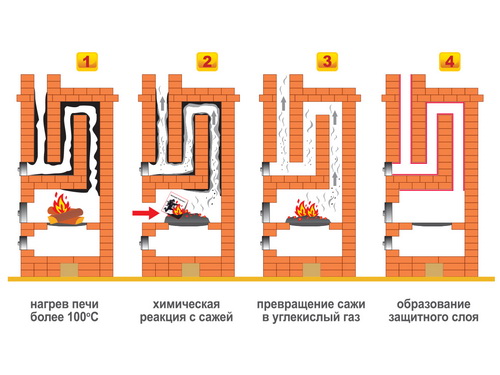 Моментальное действие. Активирует уплотнившиеся слои сажи в процессе топки. Сажа моментально удаляется с потоком, выходящих через печную трубу газов горения, предварительно разрыхляясь от образующегося углекислого газа.