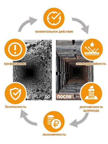 Профилактика. Действует профилактически против отложений сажи при использовании некачественного топлива. Действие средства продолжается в течение последующих 5-6 топок – предотвращает налипание углерода (сажа, копоть) к поверхности дымохода.