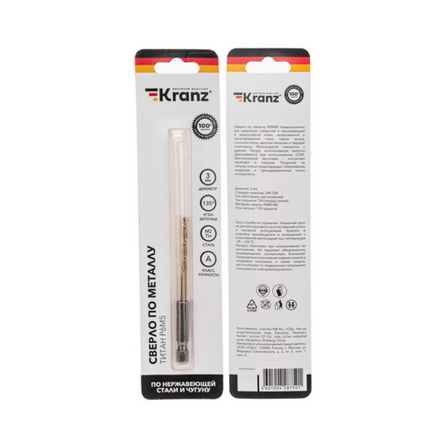 Сверло по металлу 3мм P6M5, титан, шестигранный хвостовик DIN338 KRANZ блистер (1)