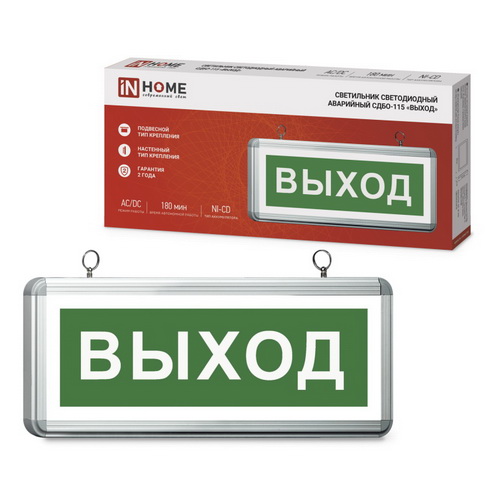 СДБО-115 «ВЫХОД» ТМ IN HOME – это односторонний аварийный светильник (указатель) на сверхъярких светодиодах в корпусе из прочного алюминия. Его основное предназначение – обеспечение эвакуационного освещения в случае аварии или пожара. Может устанавливаться в жилых, общественных, производственных помещениях (при температуре от +1 до +40°C). Может работать как от электросети, так и от встроенного никель-кадмиевого аккумулятора (время зарядки 24-48 часов). Способен функционировать в автономном режиме в течение 180 минут. Обладает встроенной защитой от разрядки аккумулятора. Устанавливается настенным (накладным), либо подвесным способом (на подвес при помощи монтажных колец, входящих в комплект). Срок службы – 30 000 часов.