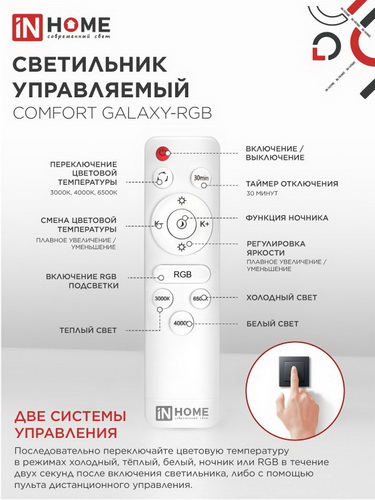 Две системы управления светильником: с помощью настенного выключателя возможно последовательное переключение цветовой температуры в режимах холодный, тёплый, белый или ночник в течении двух секунд после включения светильника, либо с помощью пульта дистанционного управления с возможностями смены цветовой температуры, диммирования и ночника.