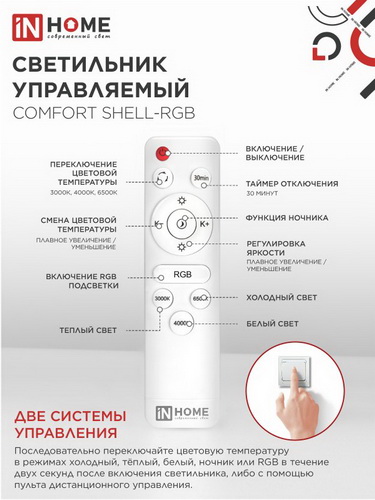 Две системы управления светильником: с помощью настенного выключателя возможно последовательное переключение цветовой температуры в режимах холодный, тёплый, белый, ночник или RGB в течение двух секунд после включения светильника, либо с помощью пульта дистанционного управления с возможностями смены цветовой температуры, диммирования и ночника, а также управление функционалом RGB.