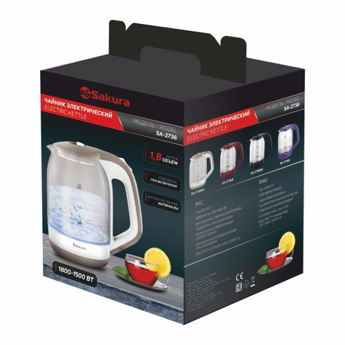 Чайник эл. SAKURA SA-2736WG 1500/1800Вт, 1,8л, диск, стекло, подсветка, цвет. белый с серым